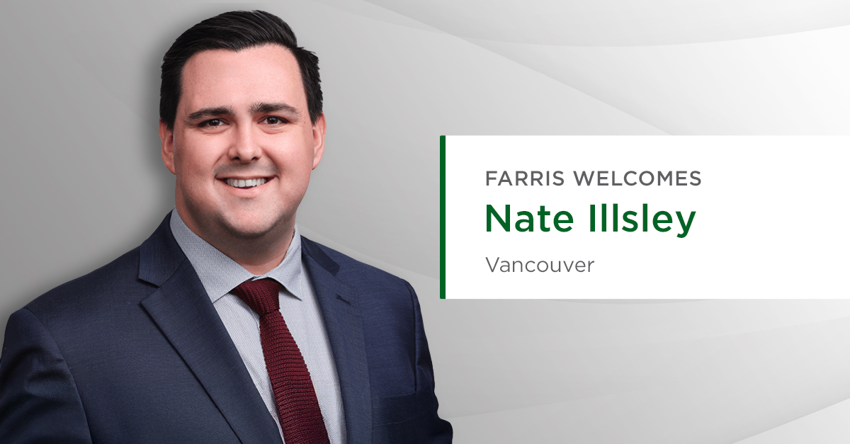 We are pleased to welcome Nathan Illsley to the firm as a Litigation Associate. Nate maintains a broad civil and commercial litigation practice. He has experience with complex commercial matters involving environmental law, tort and contract disputes, and class actions. He has assisted on matters before the Supreme Court of British Columbia, the Court of Appeal of Yukon, and the Federal Court of Canada.