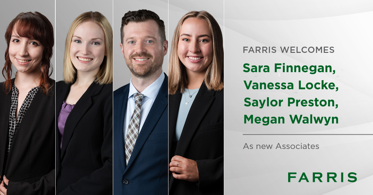 Congratulations to Sara Finnegan, Vanessa Locke, Saylor Preston, and Megan Walwyn who have completed their articles and will be joining Farris’ Associate ranks. Sara and Megan join our Litigation group, and Vanessa and Saylor join our Solicitors group. Well done all!