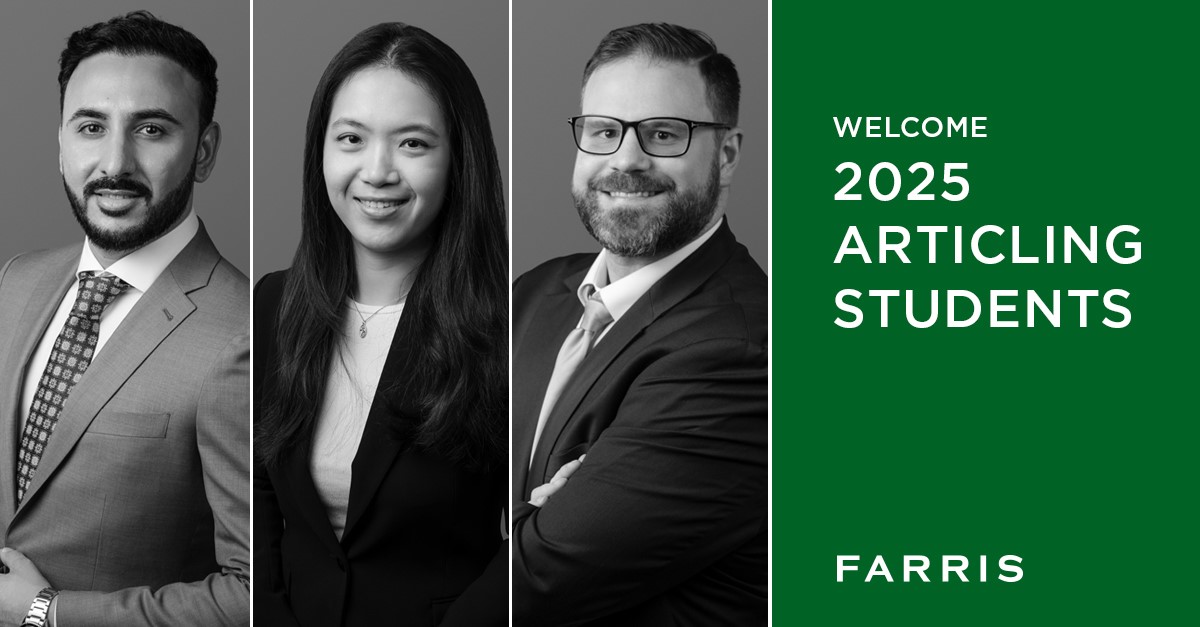 Farris is pleased to welcome three outstanding articling students to the firm! Joining us for their articling year are Bahij Mirzad (Osgoode Hall Law School), Doris Wang (Nanchang University; Allard Law LLM), and Patrick Armstrong (University of Ottawa).