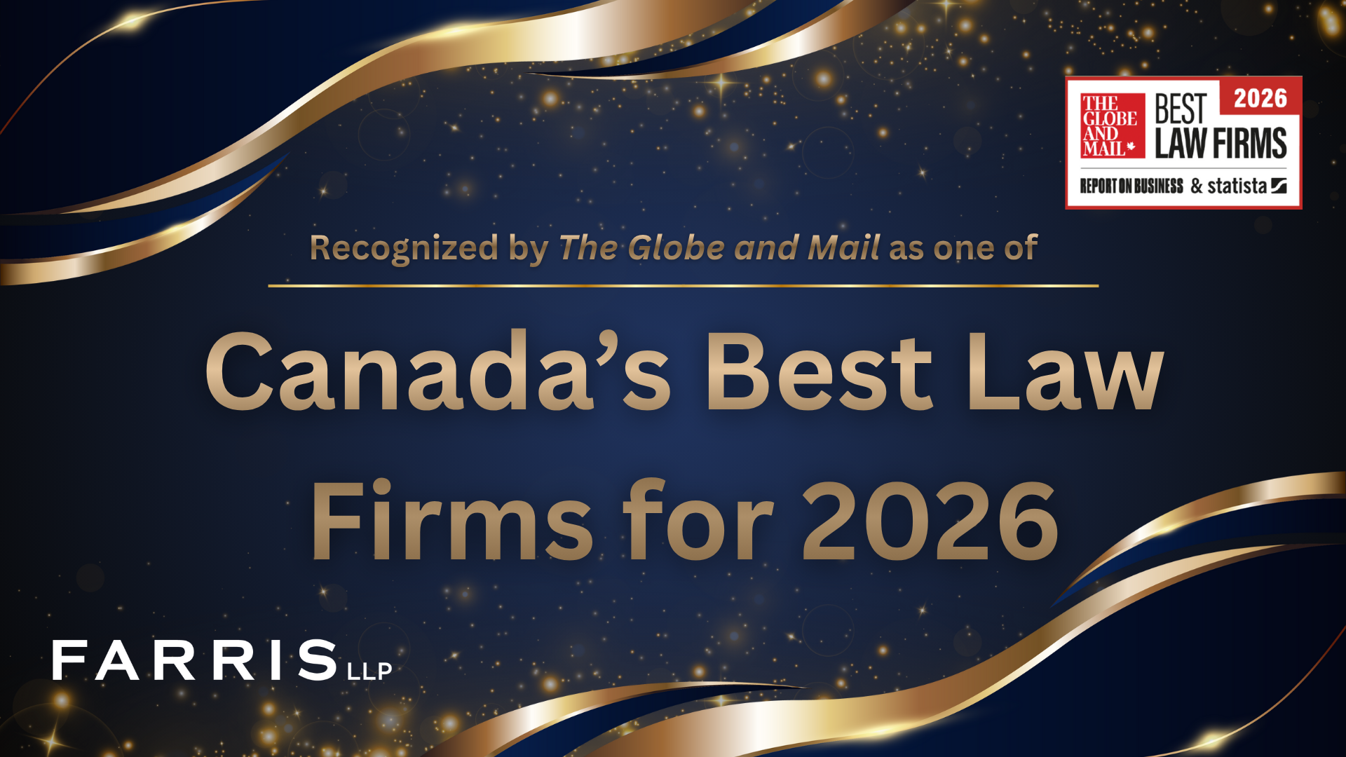 Farris is proud to be recognized for the fifth consecutive year as one of Canada’s Best Law Firms by The Globe and Mail for 2026. The ranking for Canada’s Best Law Firms is based on recommendations from both lawyers and clients across the country and highlights excellence in 31 legal specialties.