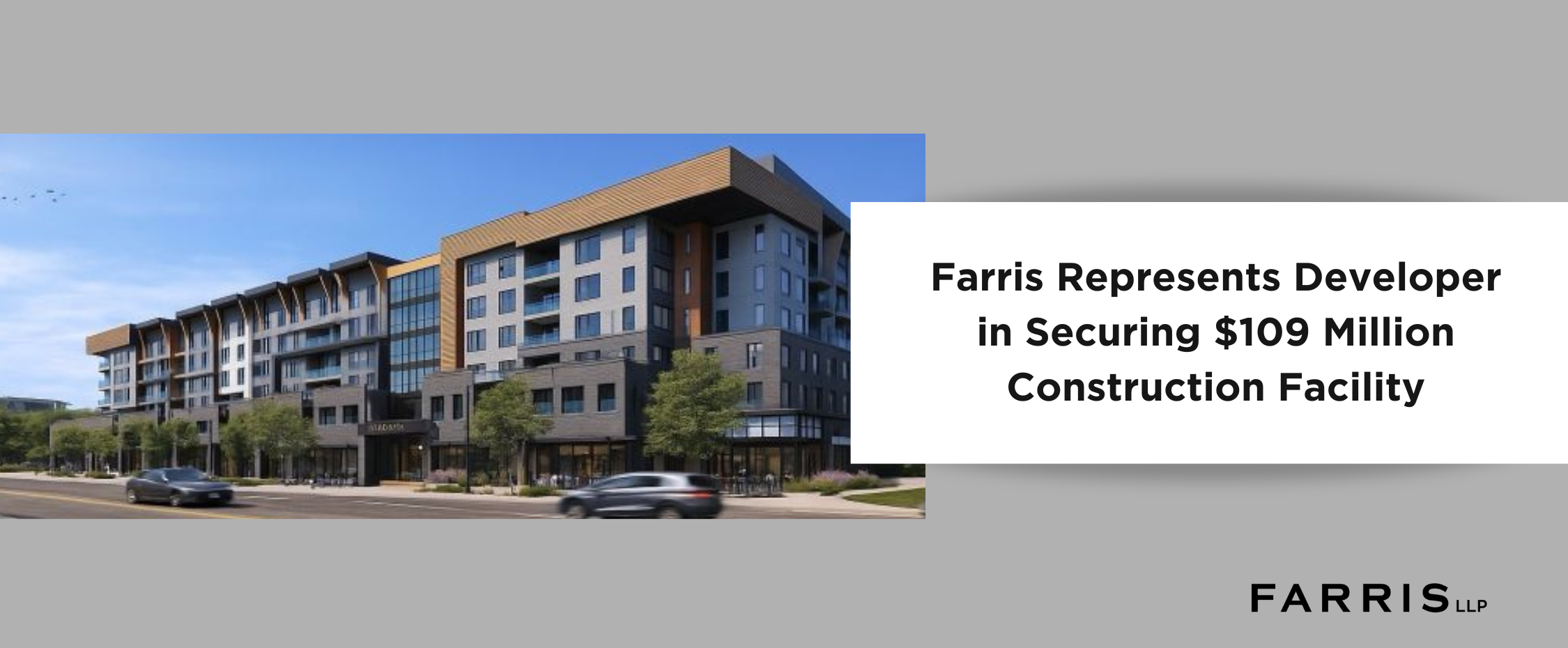 Farris is pleased to have represented the developer on a successful closing of a $109,000,000 construction financing for the development of a 212-unit strata condominium project in Langley, British Columbia. The Farris team was led by Partner Sunny Aujla and included Associates Zack Kay and Amy Blandford.