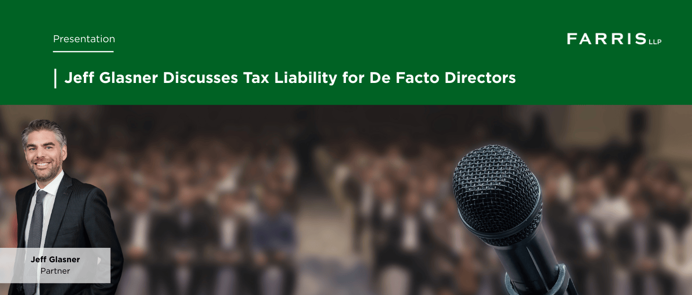 Farris Partner, Jeff Glasner, recently wrote for Lexpert’s Legal Insights series on the Canada Revenue Agency’s approach to collecting certain corporate tax debts from former directors and other unappointed individuals. The article, “De Facto Directors: Beware of What You Did Not Sign Up For”, discusses when the CRA can treat non appointed individuals as “de facto” directors for the purposes of collecting certain unpaid tax debts of a corporation, including payroll and GST/HST remittances, as well as steps former directors and other involved individuals can take to minimize their risk exposure. Read the full article here.