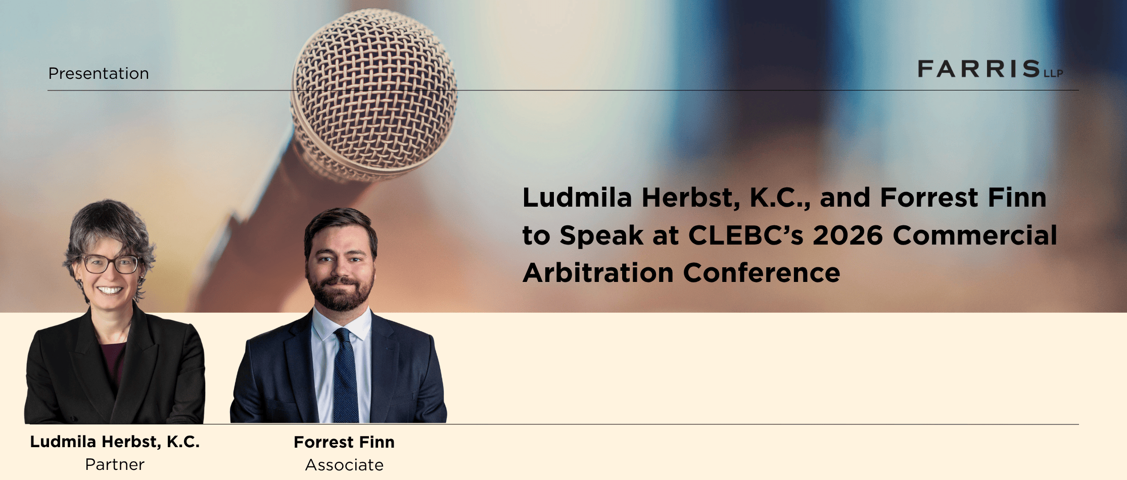 Farris partner Ludmila Herbst, K.C., is chairing and is also, alongside Farris associate Forrest Finn, co-presenting at CLEBC’s 2026 Commercial Arbitration conference. This course, which will be held both in-person and online on May 26, 2026, will bring together an impressive faculty of arbitrators, arbitration counsel and others from both bench and bar who deal with arbitration-related cases when they reach the courts. Ludmila is a litigator based in Vancouver and is the co-author of Commercial Arbitration in Canada: A Guide to Domestic and International Arbitration, a longstanding publication that continues to be cited regularly by trial and appellate courts across Canada. Forrest is a litigator based in Victoria and represents clients throughout British Columbia and Yukon. He has represented clients before both trial and appellate courts and before arbitral tribunals.